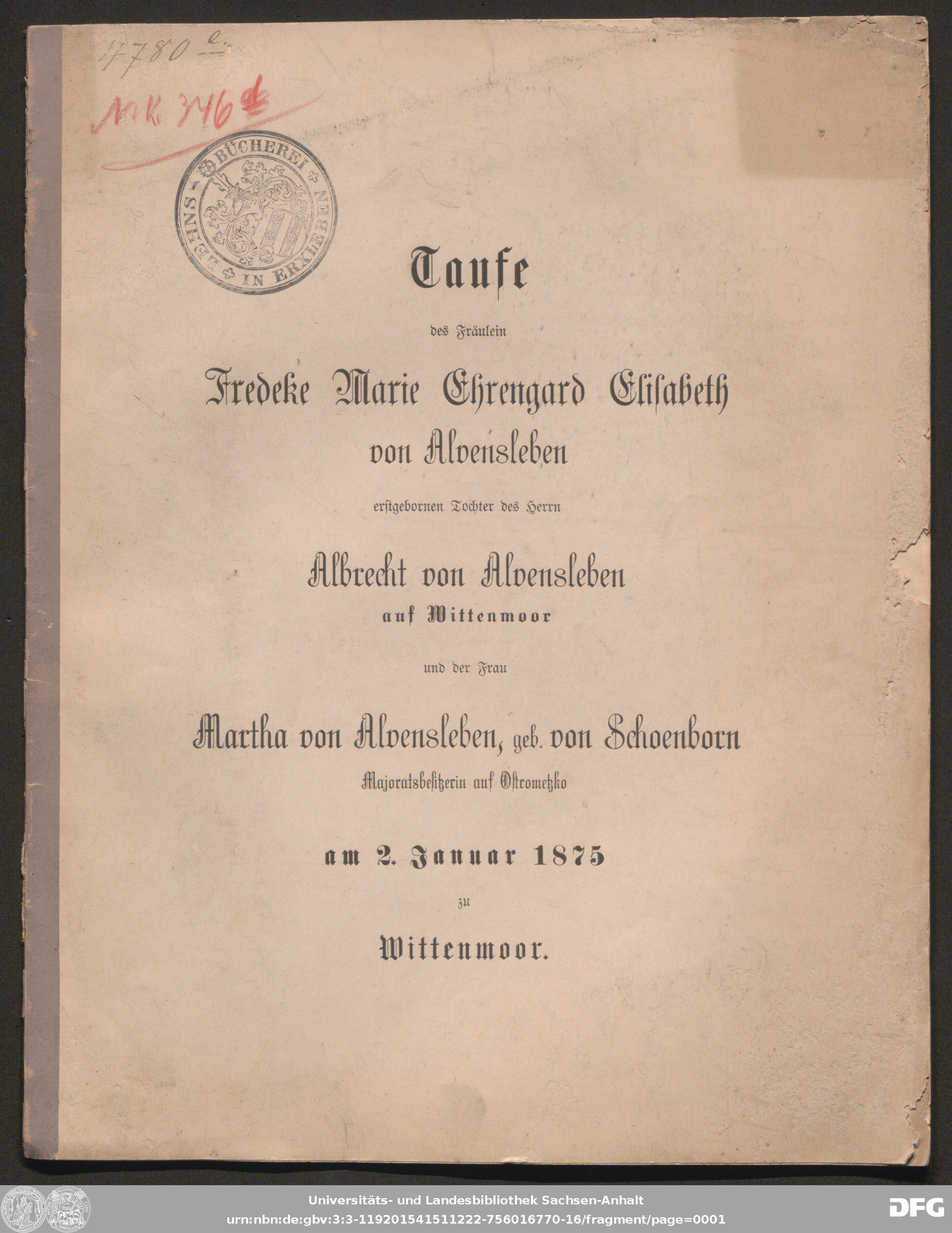 http://dx.doi.org/10.25673/121846| Title: | Taufe des Fräulein Fredeke Marie Ehrengard Elisabeth von Alvensleben erstgebornen Tochter des Herrn Albrecht von Alvensleben auf Wittenmoor und der Frau Martha von Alvensleben, geb. von Schoenborn Majoratsbesitzerin auf Ostrometzko am 2. Januar 1875 zu Wittenmoor |